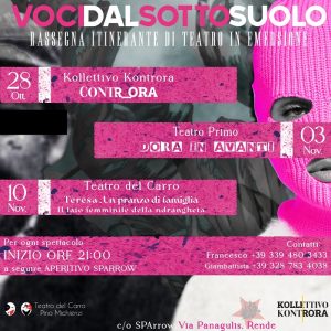 Nasce “Voci dal sottosuolo”, la rassegna itinerante di teatro in emersione organizzata allo SpA Arrow – Spazio precario autogestito, dal Kollettivo Kontrora che proprio nel centro sociale di Rende ha iniziato il suo percorso artistico nel pieno della pandemia di Covid-19. Si aggiunge come co-organizzatore dell’evento la compagnia Teatro del Carro Pino Michienzi, che di SpA Arrow è stato già ospite in passato con “Spartacu strit viù” e che ritorna con AnnaMaria De Luca in scena.
