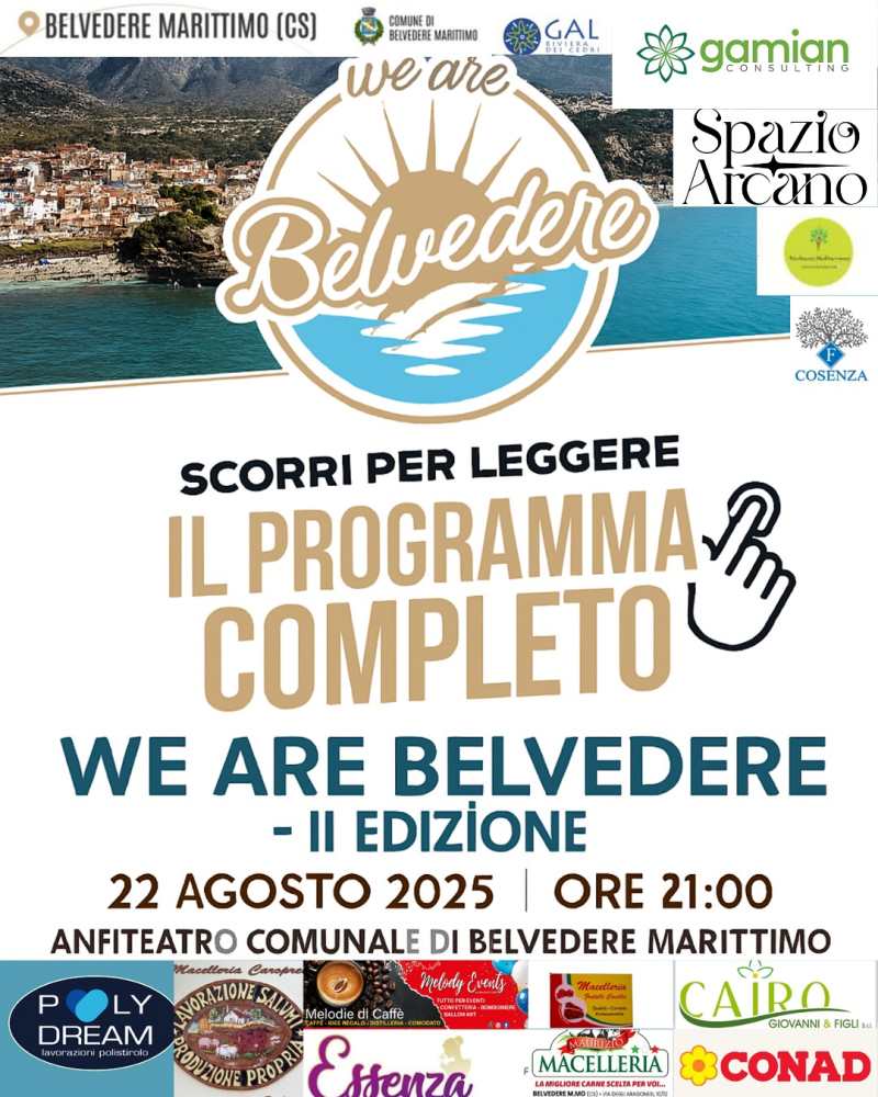 Conto alla rovescia per “We Are Belvedere”: il 22 agosto, dalle ore 21.00, sarà l’Anfiteatro di Belvedere Marittimo ad accogliere la seconda edizione della rassegna che celebra eccellenza, tradizione e innovazione del patrimonio mediterraneo. «Vogliamo un evento che parli con chiarezza al territorio e lo rappresenti con competenza e azioni, mettendo in rete esperienze e prospettive», ha affermato la presidente di Ricchezze Mediterranee, Carolina Cairo.